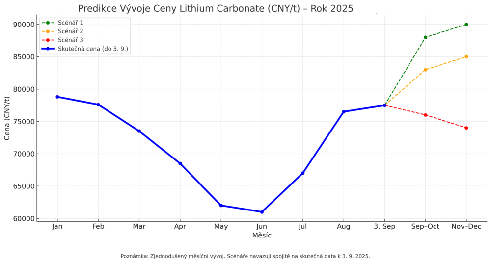 Po výrazném růstu ceny v červenci a první polovině srpna 2025, a následné korekci na konci srpna vás jistě zajímá, jaký je výhled na zbytek roku. V následující části článku se podíváme na tři realistické scénáře, které popisují vývoj spotových cen lithium-carbonátu (battery grade, EXW Čína, CNY/t) až do konce roku 2025. Každý scénář vychází z aktuálních tržních dat a ověřených zdrojů.