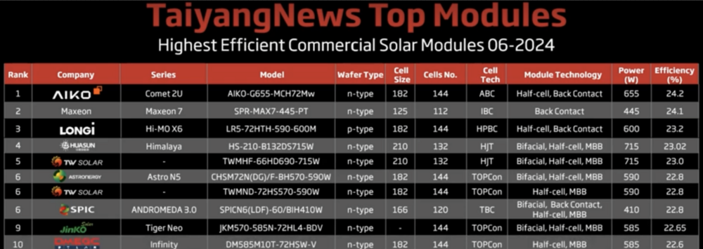 Vidíme, že Tongwei v konci roku 2024 ukončuje výrobu panelů s PERC články (TPC), což je jasné znamení do trhu, že tato technologie je překonána. Mainstreamové panely budou osazeny články TOPCon (TNC) a to ve třech velikostech waferů, což umožňuje mít nejširší možné portfolio. Postupně končí články M10 a budou nahrazeny články G12 a G12R, které mají lepší elektrické charakteristiky a možnosti. Na několika výrobních linkách právě probíhá upgrade na THC panely, které využívají technologii dvoupřechodových článků (HJT). Panely z obou zmíněných řad se již pravidelně objevují v žebříčku TaiyangNews na předních místech: