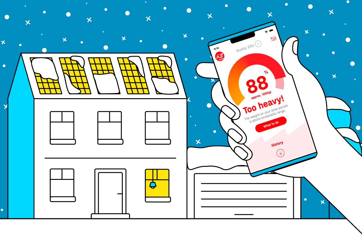 S K2 Buddy můžete těmto problémům snadno předejít. Buddy pravidelně měří zatížení panelů a umožňuje majitelům a instalačním technikům sledovat zatížení sněhem 24 hodin denně 7 dní v týdnu v reálném čase. Princip je velmi jednoduchý: systém se skládá z vážících senzorů a aplikace ve vašem chytrém telefonu.